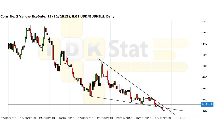 Сценарий падения: медвежий сценарий, описанный нами в прошлом прогнозе, похоже, начинает реализовываться. Цены не стали пробивать сопротивление, а пробили поддержку, не дав реализоваться бычьему клину. Ход к 400.00 теперь выглядит логичным. Дальнейшее ослабление кукурузы будет осуществлять все сложнее, так как количество среднесрочных спекулянтов — покупателей по мере падения будет возрастать.