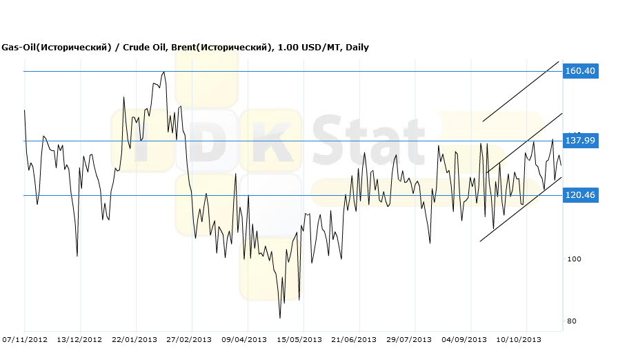 Сценарий роста: спред расширился почти до своих пятилетних исторических максимумов, после чего начал интенсивно снижаться, и вернулся в оставленный ранее ценовой канал. Коррекция на данном этапе выглядит справедливой и падение до района 208.00 вполне допустима. С текущих уровней возможны отскоки к 240.00 и борьба вблизи этих уровней, но пока коррекция к предыдущему росту не выглядит завершенной.
