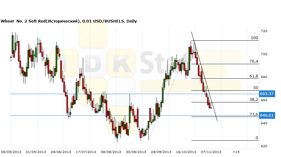 Сценарий падения: интенсивное движение вниз на протяжении двух недель загнало рынок в перепроданность. В районе 645.00 спекулянты, вставшие в продажу, будут фиксировать прибыль, что должно замедлить темпы падения. В случае пробоя 645.00 за один торговый день, мы можем увидеть падение пшеницы до отметки 600, после чего рынок с большой долей вероятности войдет в затяжной диапазон на следующие три месяца, так как новых идей не будет.