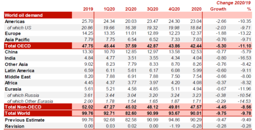 Показатель спроса в странах ОЭСР был пересмотрен в сторону снижения на 0.5 млн. баррелей в день. Ожидается, что в 2020 году данный показатель сократится на 5.3 млн. баррелей в день.