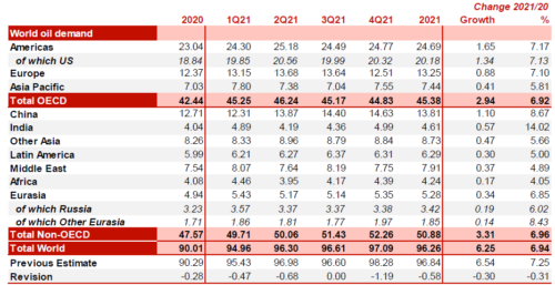 Вместе с тем, прогноз по спросу на нефть в 2021 году был пересмотрен в сторону снижения на 0.3 млн. баррелей в день. В настоящий момент ожидается рост спроса в следующем году на 6.2 млн. баррелей в день.