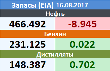 Коммерческие запасы нефти в США упали на -8.945 до 466.492 млн. баррелей. Запасы бензина выросли на 0.022 до 231.125 млн. баррелей. Запасы дистиллятов выросли на 0.702 до 148.387 млн. баррелей. Запасы в хранилище Кушинг выросли на 0.678 до 57.047 млн. баррелей.