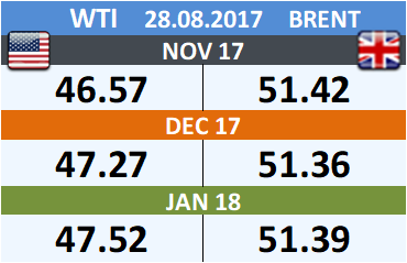 На 28.08.2017 стоимость нефти марки Brent на бирже ICE по контракту OCT 17 составила 51.89 доллара за баррель. За прошедшую неделю стоимость нефти марки Brent выросла на 0.23 $/баррель. Как мы видим, на графике, фьючерсная кривая имеет периоды, когда более дальний фьючерс дешевле ближнего. Состояние бэквардации наблюдаем на следующих контрактах: NOV 17; DEC 17. Таким образом, трейдеры предполагают, что возможно превалирование предложения над спросом в указанные периоды, если рынок будет находиться на данных ценовых уровнях.