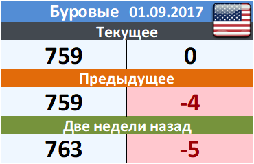 По сообщению Baker Hughes количество нефтяных буровых установок в США на 1.09.2017 составило 759 штук. За неделю количество буровых установок осталось неизменным и составляет 759 единиц. На прошлой неделе количество установок, которые прекратили работу составило 6 единиц. Количество установок, которые ввели в эксплуатацию составило 6 единиц.