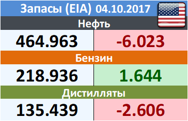 Коммерческие запасы нефти в США упали на -6.023 до 464.963 млн. баррелей. Запасы бензина выросли на 1.644 до 218.936 млн. баррелей. Запасы дистиллятов упали на -2.606 до 135.439 млн. баррелей. Запасы в хранилище Кушинг выросли на 1.525 до 62.462 млн. баррелей.