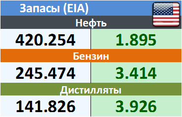 Коммерческие запасы нефти в США выросли на 1.895 до 420.254 млн. баррелей. Запасы бензина выросли на 3.414 до 245.474 млн. баррелей. Запасы дистиллятов выросли на 3.926 до 141.826 млн. баррелей.