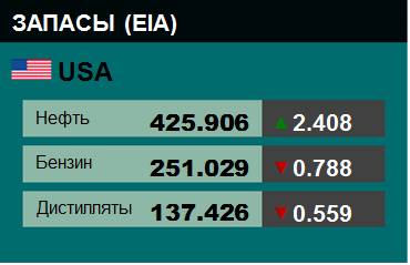 Коммерческие запасы нефти в США выросли на 2.408 до 425.906 млн. баррелей. Запасы бензина упали на -0.788 до 251.029 млн. баррелей. Запасы дистиллятов упали на -0.559 до 137.426 млн. баррелей.