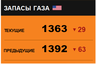 За неделю запасы природного газа в хранилищах упали на -29 млрд. куб. футов.