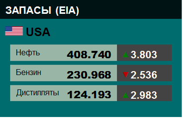Коммерческие запасы нефти в США выросли на 3.803 до 408.74 млн. баррелей. Запасы бензина упали на -2.536 до 230.968 млн. баррелей. Запасы дистиллятов выросли на 2.983 до 124.193 млн. баррелей. Запасы в хранилище Кушинг упали на -1.338 до 22.393 млн. баррелей.