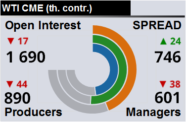 За прошлую неделю разница между OI производителей и OI управляющих сократилась на 44 053 контракта. Разница между длинными позициями производителей и управляющих сократилась на 4 858 контрактов. Разница между короткими позициями производителей и управляющих сократилась на 20 234 контракта.