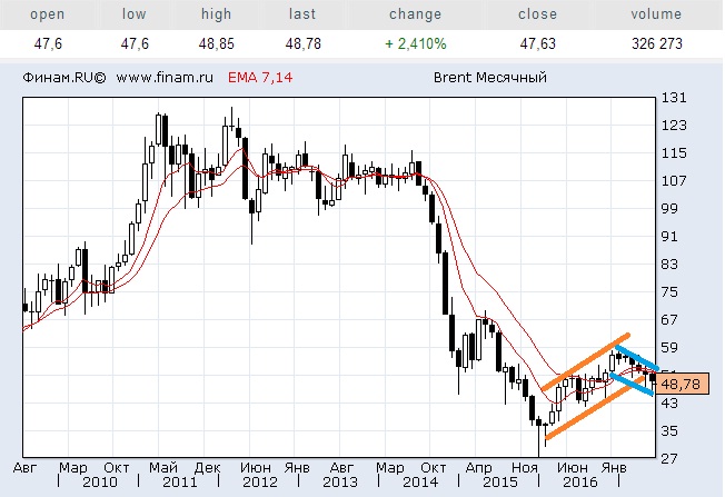 Котировки нефти Brent в последней декаде июня сломали долгосрочный аптренд (см. рисунок) и достигли уровня $44,5. Затем последовал ожидаемый отскок вверх, закрытие прошло по $48,8.