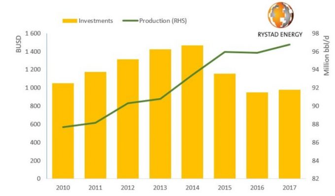 Хотя тенденция по инвестированию для нефтегазовых компаний с момента начала кризиса существенно ослабла, с 2015 года объемы производства нефти остаются на достаточно стабильном уровне. Это означает, что компании быстро нашли способ оставаться продуктивными в новой ценовой среде. Однако, более детальный анализ показывает, что спада в производстве не наблюдается благодаря согласованным до 2014 года нефтяным проектам. В то же время, падение капитальных затрат в нефтегазовой отрасли повлекло сокращение объемов добычи нефти на старых месторождениях, где активность по бурению новых скважин замедлилась на 50%.