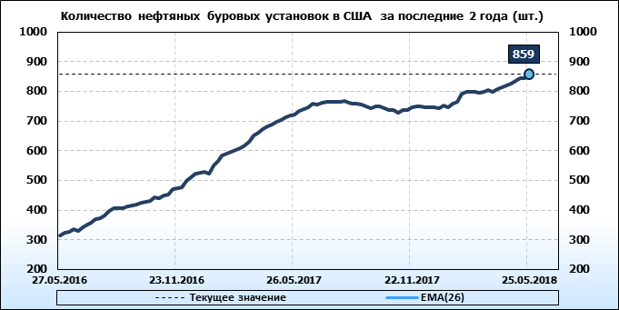 По сообщению Baker Hughes количество нефтяных буровых установок в США на 25.05.18 составило 859 штук. За неделю количество буровых установок выросло на 15 единиц. На прошлой неделе количество установок, которые прекратили работу составило 4 единицы. Количество установок, которые ввели в эксплуатацию составило 19 единиц. По итогам недели рост количества установок очевиден.