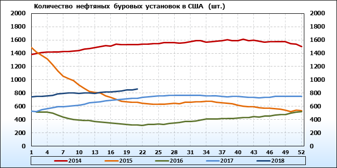 Baker Hughes. Количество буровых установок в США. Данные на 25.05.2018