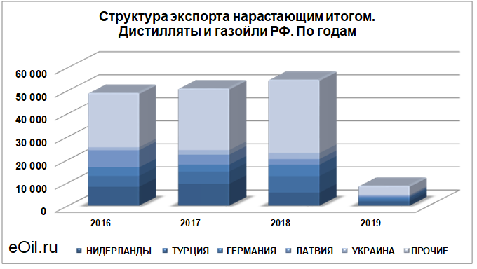 Структура экспорта дистиллятов и газойлей из России нарастающим итогом по годам