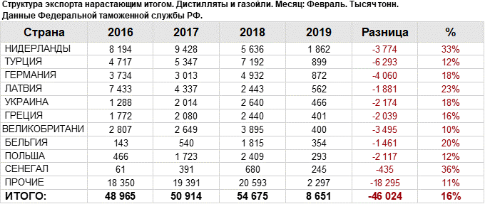 Структура экспорта дистиллятов и газойлей из России с января по февраль 2019