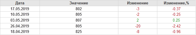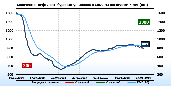 По сообщению Baker Hughes количество нефтяных буровых установок в США на 17.05.19 составило 802 штуки. За неделю количество буровых установок упало на 3 единицы. На прошлой неделе количество установок, которые прекратили работу составило 5 единиц. Количество установок, которые ввели в эксплуатацию составило 2 единицы. Видим, что по итогам недели падение числа установок незначительное.