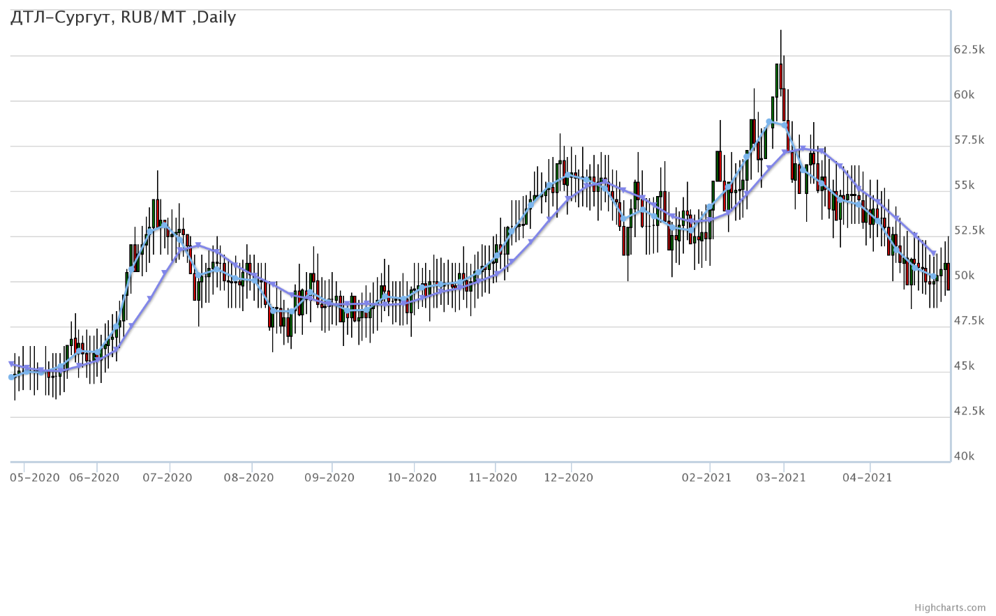 Цены на топливо дизельное ДТ-А-К5, базис поставки Ханты-Мансийский АО, снизились за неделю на 369 рублей до 49531 рубля за тонну.