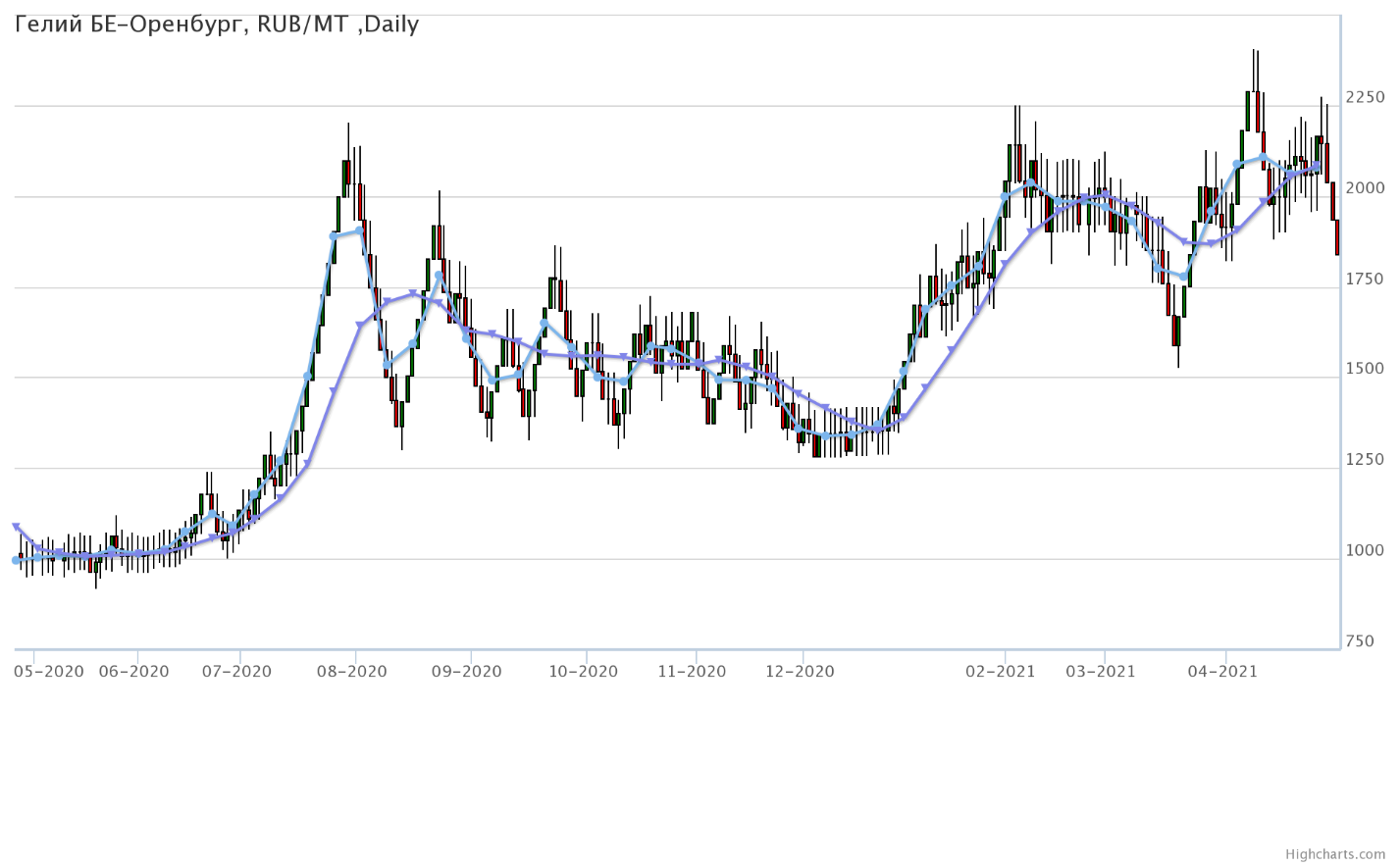 Цены на гелий газообразный, базис поставки Оренбургская область, снизились за неделю на 220 рублей до 1841 рубля за кубический метр.