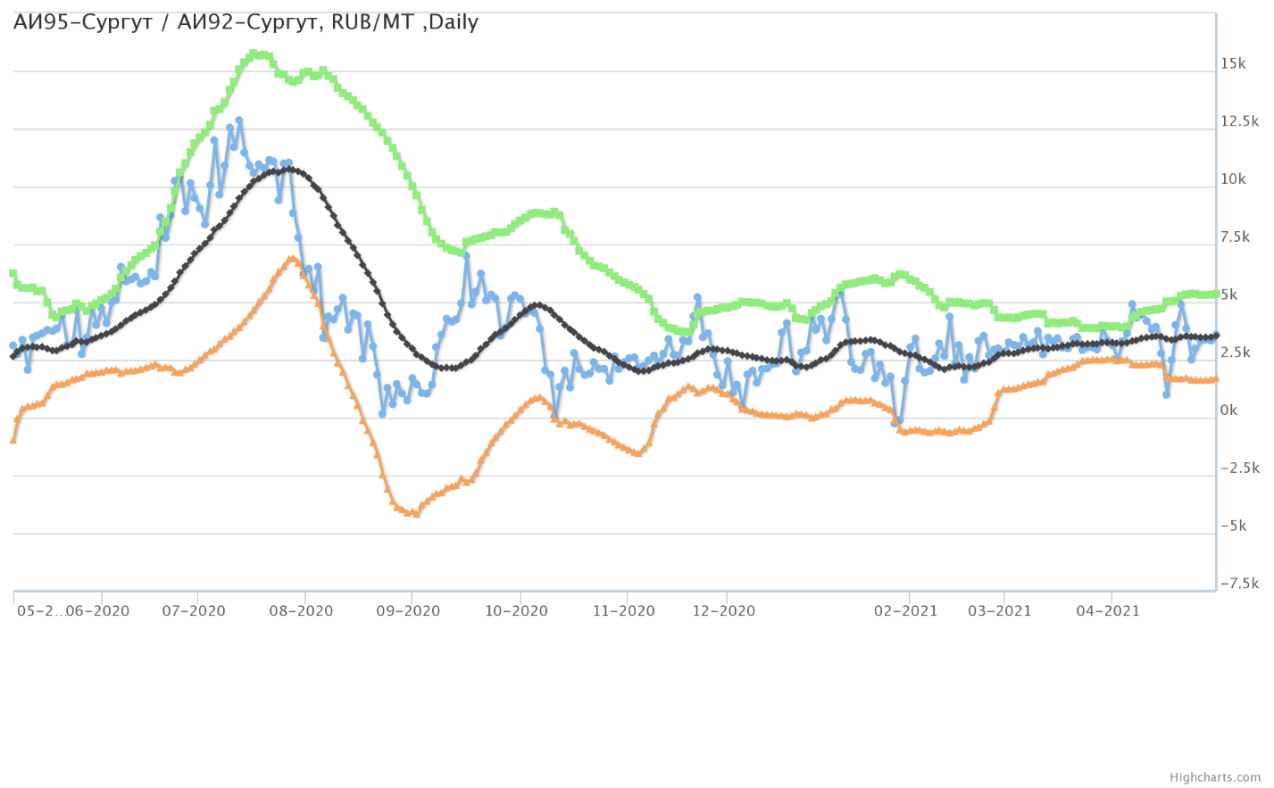 Разница цен между 95-м и 92-м бензином на базисе Сургут (Ханты-Мансийский а.о.).