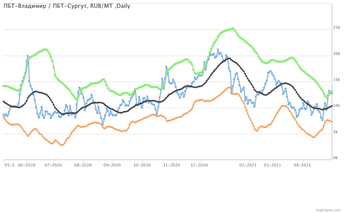Разница цен между ПБТ на базисе Владимир и ПБТ на базисе Сургут (Ханты-Мансийский а.о.).