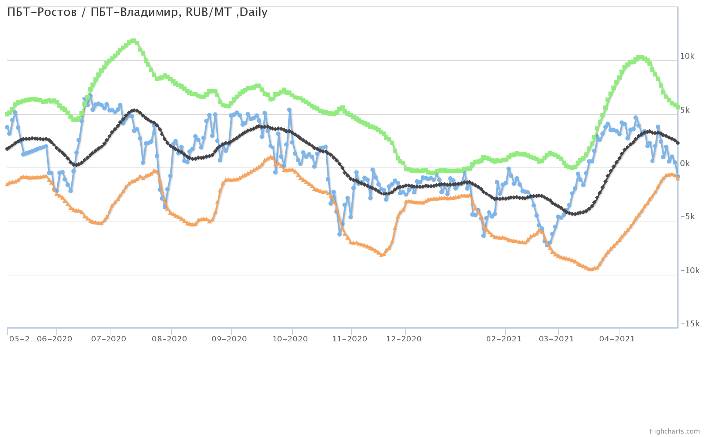 Разница цен между ПБТ на базисе Ростов и ПБТ на базисе Владимир.