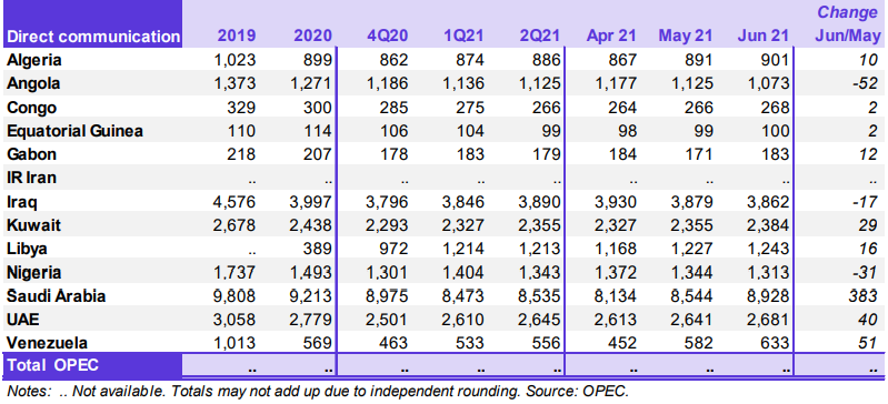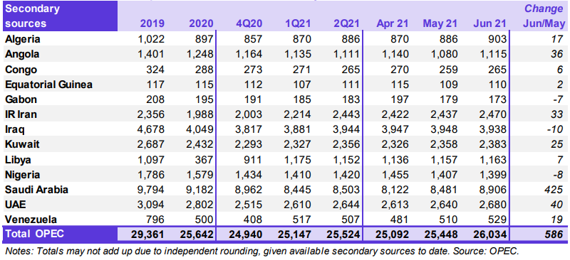 Согласно вторичным источникам, общий объем добычи нефти странами ОПЕК-13 в июне 2021 года в среднем составил 26,03 млн баррелей в день, что выше аналогичного показателя за предыдущий месяц на 0,59 млн баррелей в день. Добыча нефти увеличилась в основном в Саудовской Аравии, ОАЭ, Анголе, Иране, Кувейте, в то время как добыча нефти снизилась в Ираке, Нигерии и Габоне.