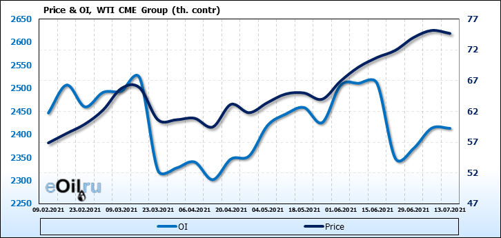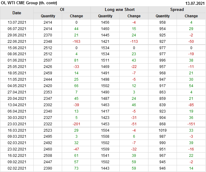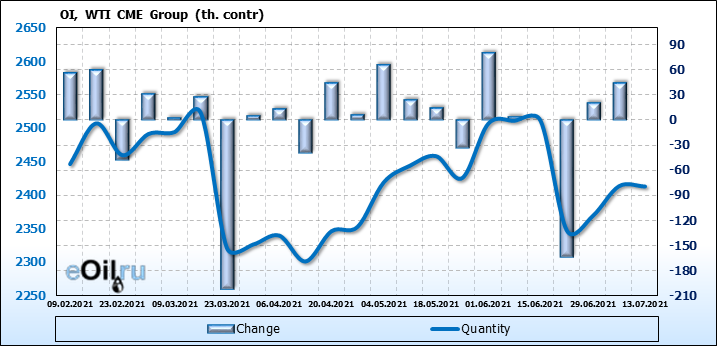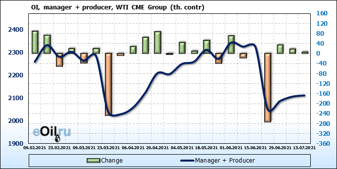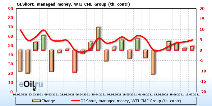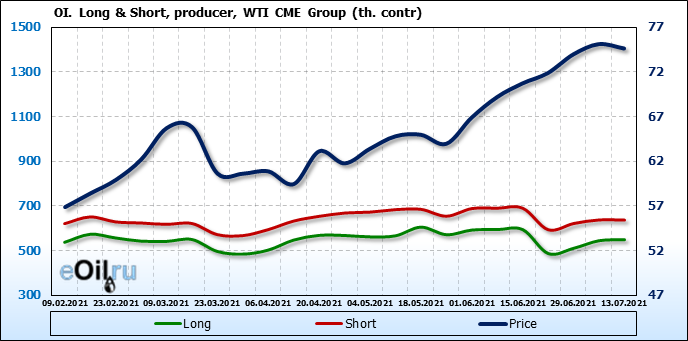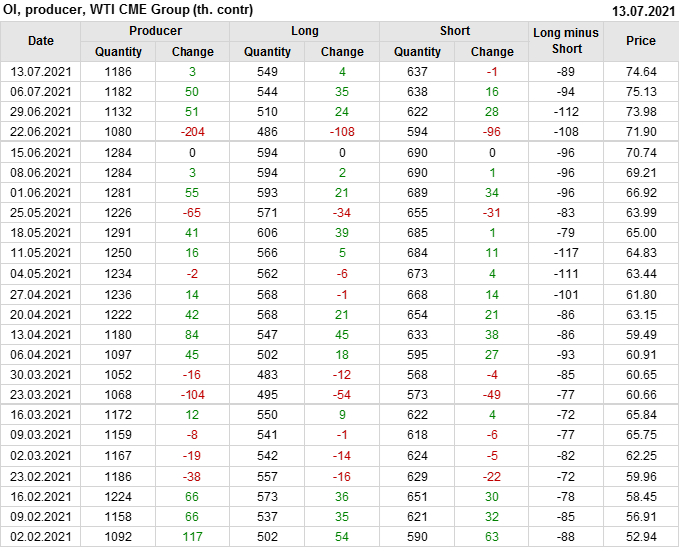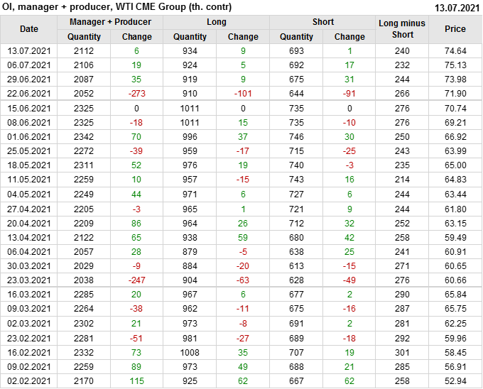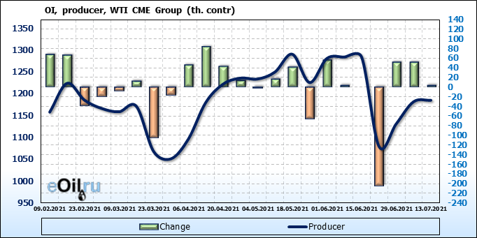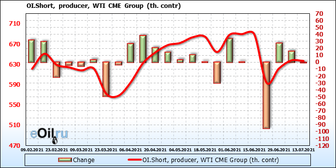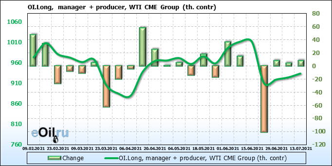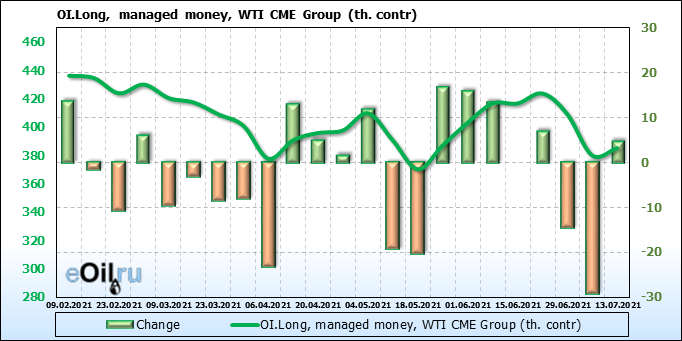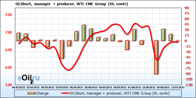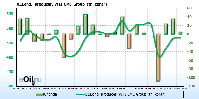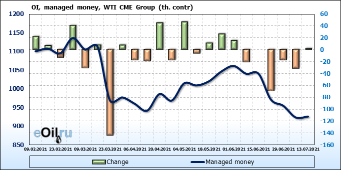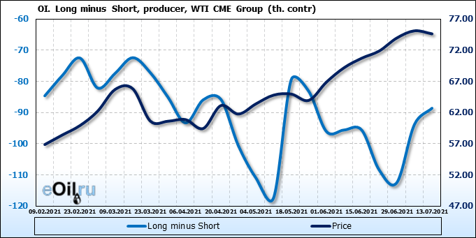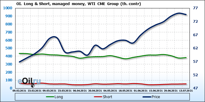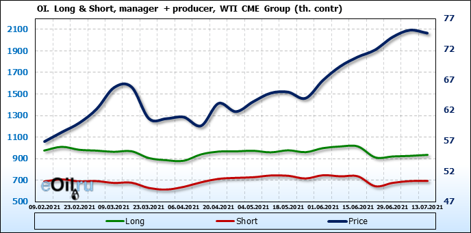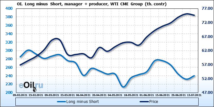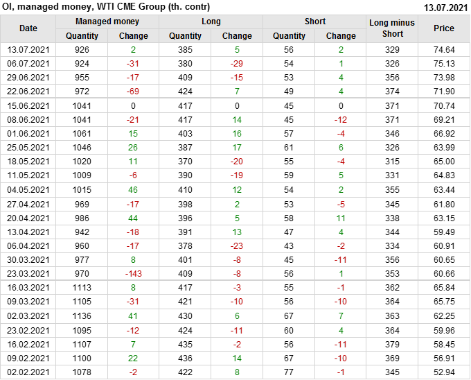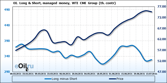 За прошлую неделю, 07.07.21 — 13.07.21, разница между длинными и короткими позициями управляющих увеличилась на 3.1 тыс. контрактов. В тоже время, цена упала на 0.49 доллара.