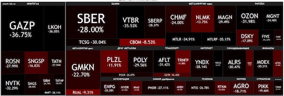 Индекс РТС, отражающий долларовую капитализацию 43 крупнейших компаний рухнул на 35,2%, рублевый индекс МосБиржи на 28,8% — больше, чем в дни глобального финансового кризиса-2008, или после дефолта 1998 года.
