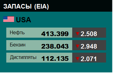 Коммерческие запасы нефти в США упали на -2.508 до 413.399 млн. баррелей, при прогнозе +0.114 млн. баррелей. Запасы бензина упали на -2.948 до 238.043 млн. баррелей. Запасы дистиллятов упали на -2.071 до 112.135 млн. баррелей. Запасы в хранилище Кушинг выросли на 1.235 до 25.242 млн. баррелей.