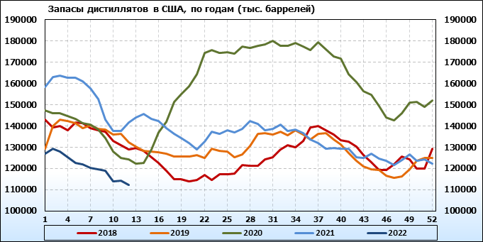 Спрос на дистилляты вырос на 0.812 до 4.516 млн. баррелей. Производство дистиллятов выросло на 0.034 до 4.979 млн. баррелей. Импорт дистиллятов упал на -0.05 до 0.172 млн. баррелей. Экспорт дистиллятов упал на -0.484 до 0.931 млн. баррелей в день.