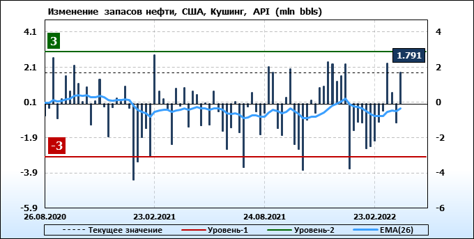 Коммерческие запасы нефти в США по данным института API выросли на 1.08 млн. баррелей, при прогнозе -2.056 млн. баррелей.