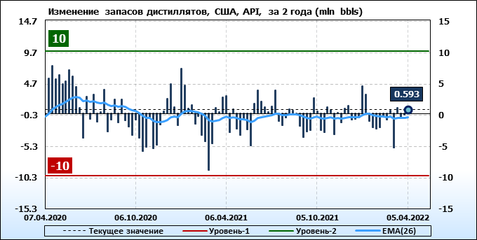 Запасы дистиллятов в США по данным института API выросли на 0.593 млн. баррелей.