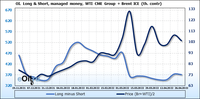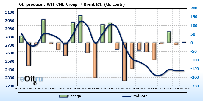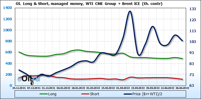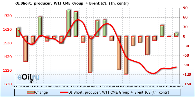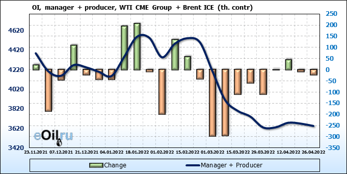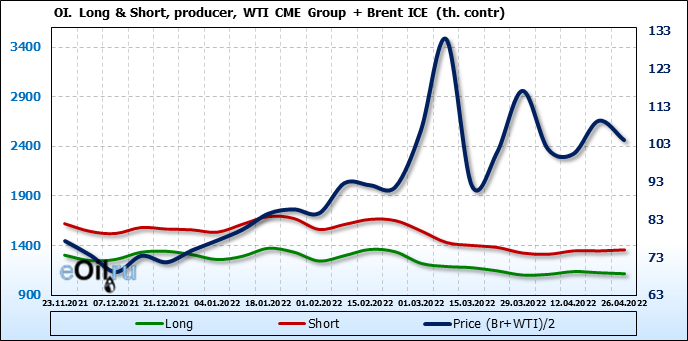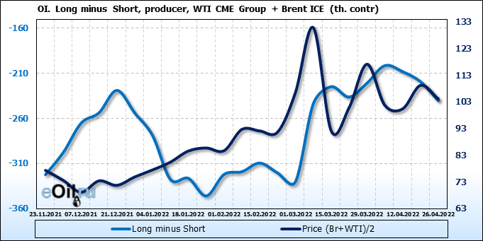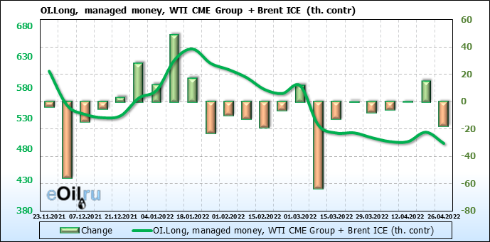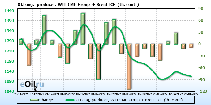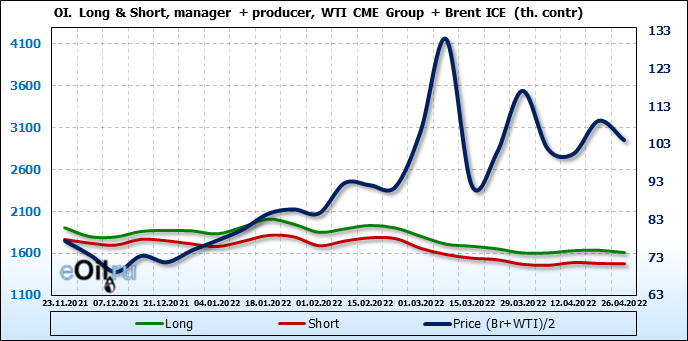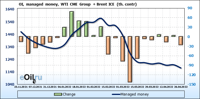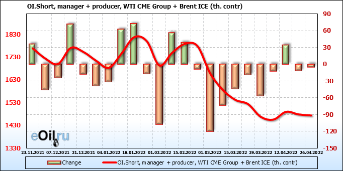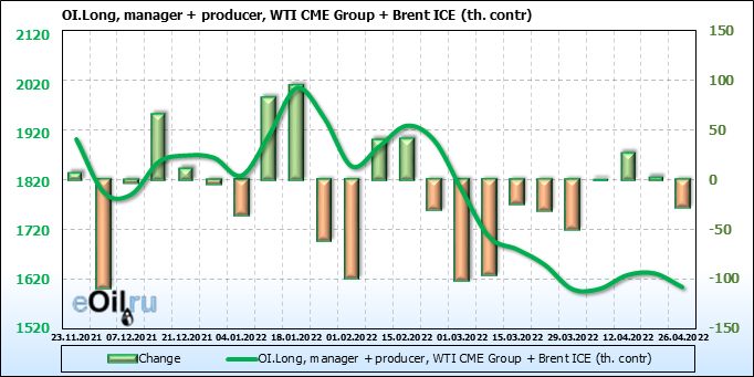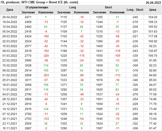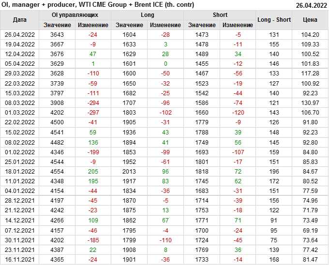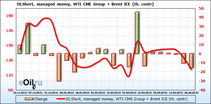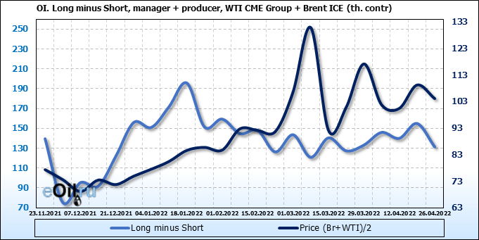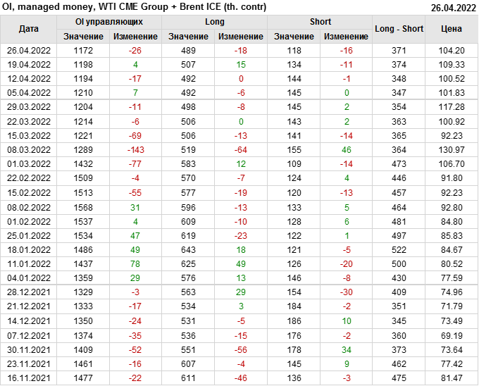 За прошедшую неделю, 20.04.22 — 26.04.22, разница между длинными и короткими позициями управляющих сократилась на 2.5 тыс. контрактов. В тоже время, цена упала на 5.13 доллара.