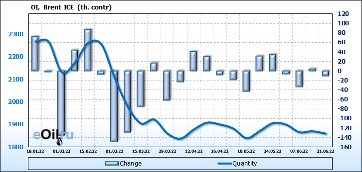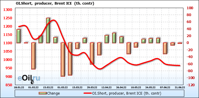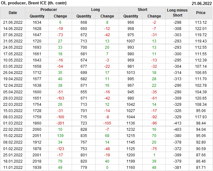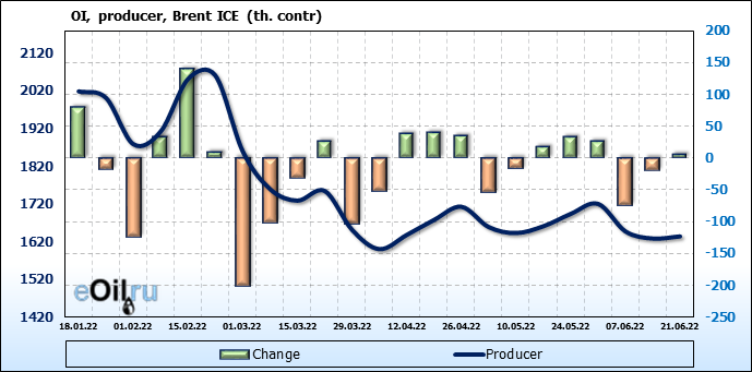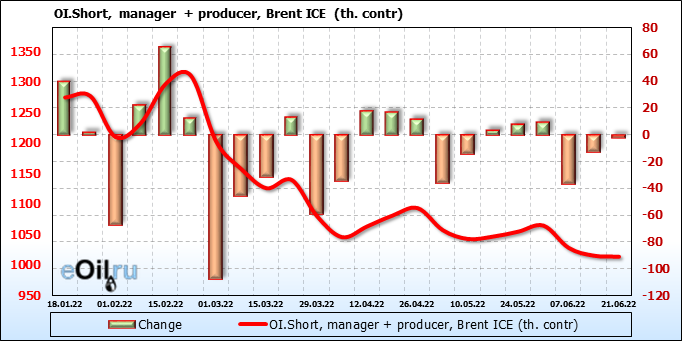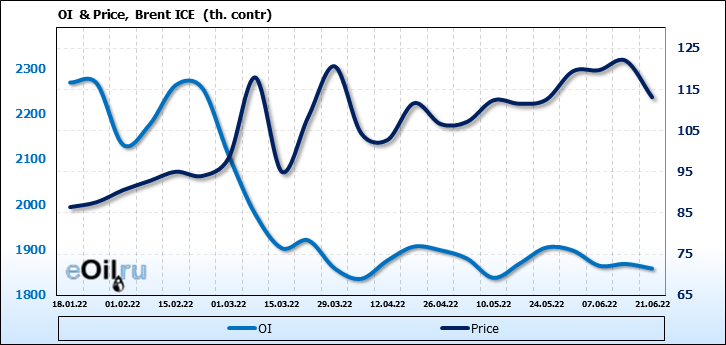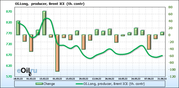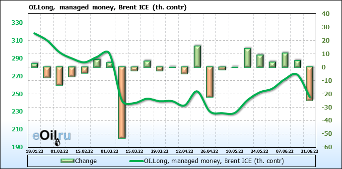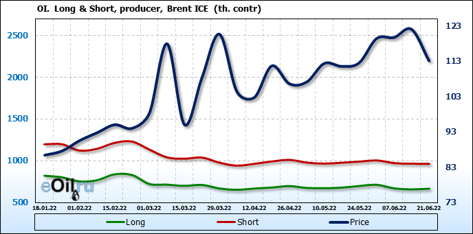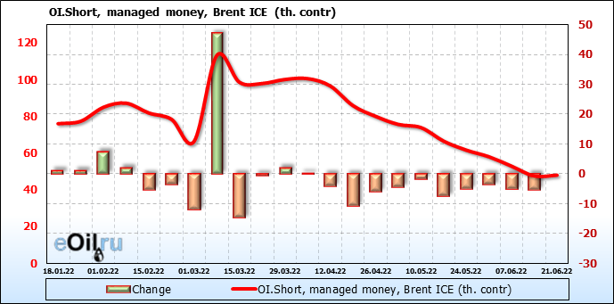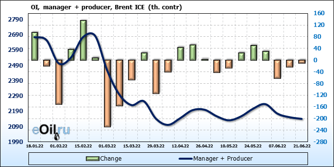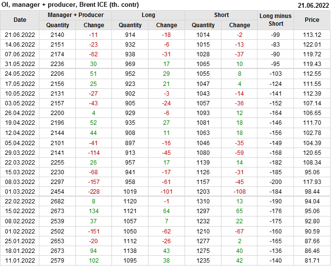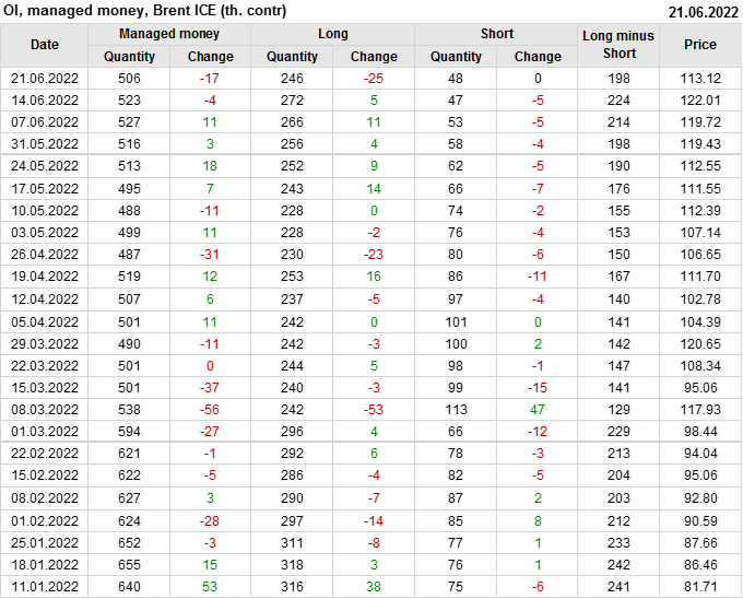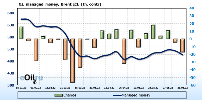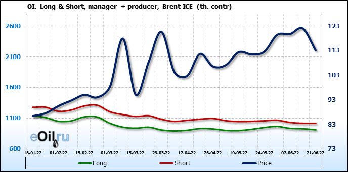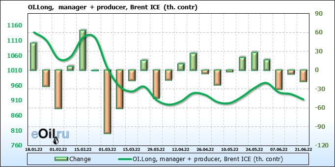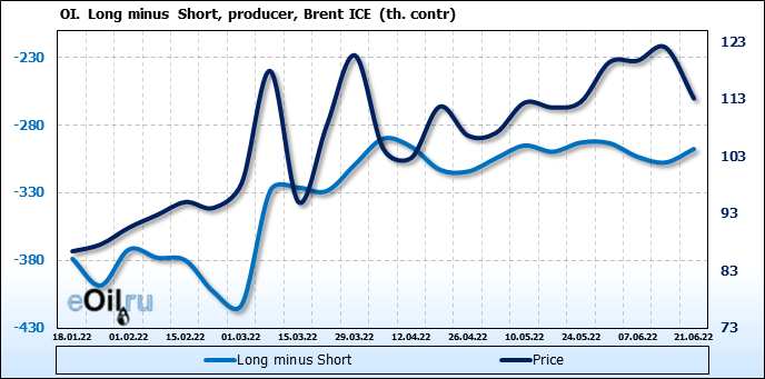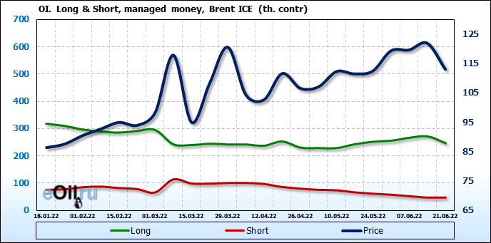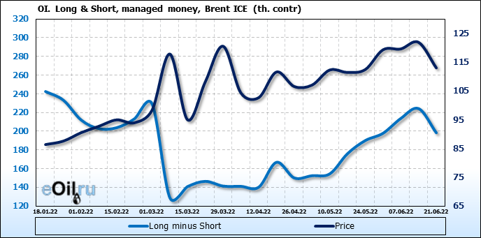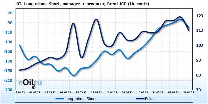 За прошедшую неделю, 15.06.22 — 21.06.22, разница между длинными и короткими позициями управляющих сократилась на 25.9 тыс. контрактов. В тоже время, цена упала на 8.89 доллара.