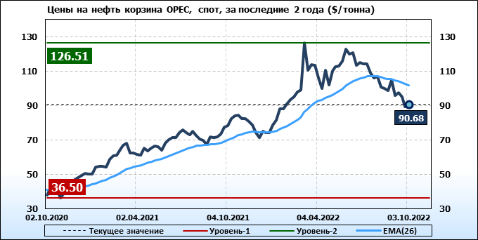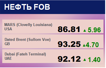 Цены на нефть сорта WTI с базиса поставки Кушинг выросли на 6.88 до 84.05 долларов за баррель. Тренд на рынке WTI медвежий. Цены на нефть сорта Brent с поставкой из портов ЕС выросли на 8.13 до 90.68 долларов за баррель. Тренд на рынке Brent падающий. Цены на корзину сортов нефти стран членов ОПЕК выросли на 1.18 до 90.68 долларов за баррель. Ценовая тенденция по корзине ОПЕК направлена вниз. Цена на сорт MARS выросла на 5.96 до 86.81 долларов за баррель. Цена на сорт Oman выросла на 5 до 92.22 долларов за баррель. Сорт марки Dubai подорожал на 1.4 до 92.12 долларов за баррель.