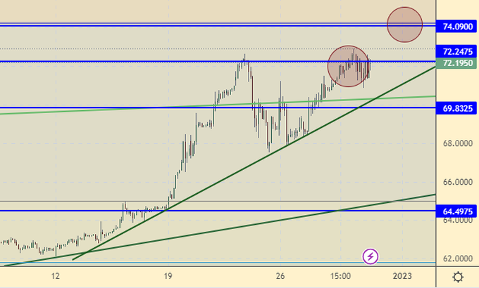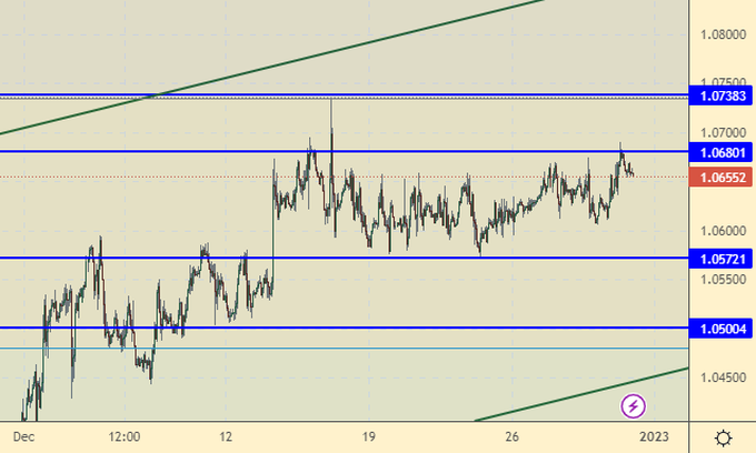 После достаточно активных событий трейдеры превзошли себя: все ушли. То ли есть салат, то ли кататься на лыжах. Пара стоит. Отметим, что выход из этого диапазона станет во многом определяющим событием не только на горизонте один квартал, но и возможно на горизонте 1 год. Есть подозрения, что воротилы не видят смысла в сильном долларе. Неужто будут развивать свою промышленность и улучшать показатели торгового баланса.
