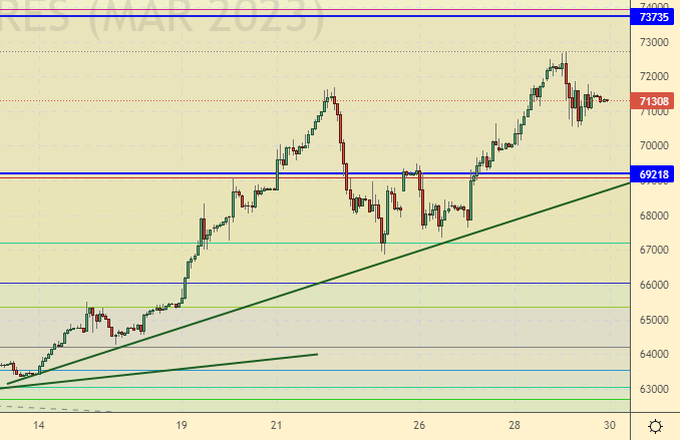 Читая наши прогнозы, вы могли взять ход вверх по паре доллар/рубль от 69.50 до 71.70, а также ход вверх на фьючерсе на пару доллар/рубль от 68000 до 71900.