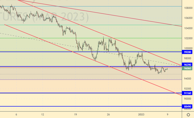 Пока мы не поднимемся выше 100000 говорить о том, что у нас появились шансы на рост, не стоит. Цены в падающем канале. В рамках текущего движения можем дойти до 90000 (80000). Так как санкции сохраняются говорить о перспективах получения прибыли экспортными гигантами некорректно.