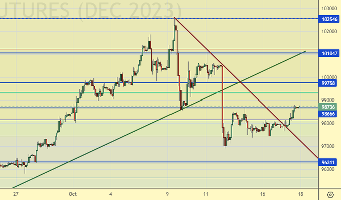 Читая наши прогнозы, вы могли взять ход вниз по фьючерсу на пару доллар/рубль от 99000 до 98300.
