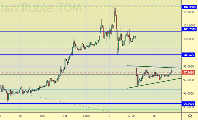 Итак… мы не укрепляемся. Это нехорошо. У уровня 100.00 будет битва (будет ли…), после чего мы в спокойной ситуации отправимся вниз. А вот если выяснится, что никто валюту продавать не собирается, несмотря на указы, то тогда начнется крайне неприятная история с забросом цен в район 115.00, для начала.