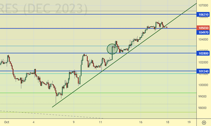 Будем держать лонг. Нельзя отрицать возможности ослабления до 103000 (например, рубль сходит к 100.00, прежде чем начать укрепляться) после чего рост скорее всего будет продолжен. Голубые фишки смотрятся неплохо.