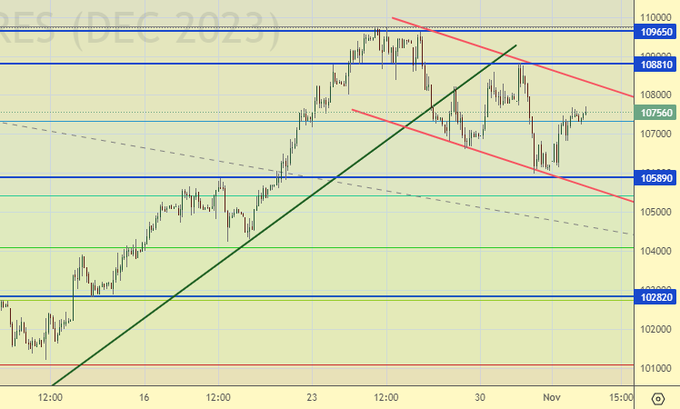 Пытаемся нарисовать падающий канал. Пока нельзя говорить о том, что мы обязательно остынем до 103000, но это был бы неплохой сценарий для входа в лонг. Если инфляция не остановится, то российские бумаги продолжат расти. Помним о «предновогоднем ралли» которое может состоятся в случае если текущая ситуация не ухудшится.