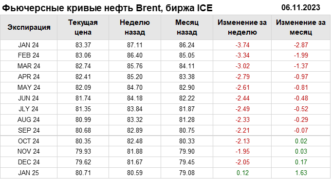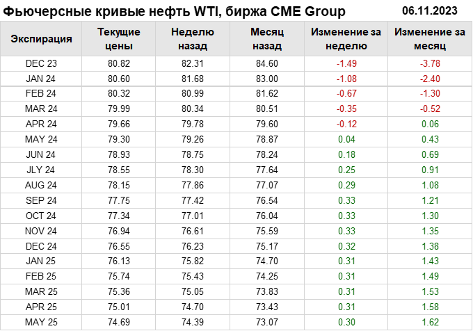 Нефть. Фьючерсные кривые на 6 ноября 2023