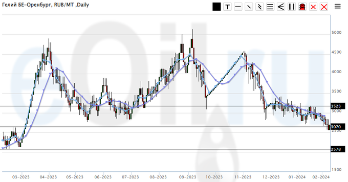 Цены на гелий газообразный, базис поставки Оренбургская область, снизились за неделю на 154 рубля до 2697 рублей за кубический метр.