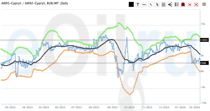 Разница цен между 95-м и 92-м бензином на базисе Сургут (Ханты-Мансийский а.о.).