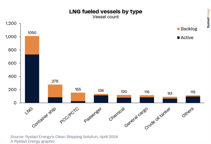 Вопреки повышенному спросу на суда с двухтопливным двигателем, работающие на метаноле и аммиаке, судоходство предпочитает выбирать сжиженный природный газ (СПГ) в качестве топлива, согласно исследованию Rystad Energy.