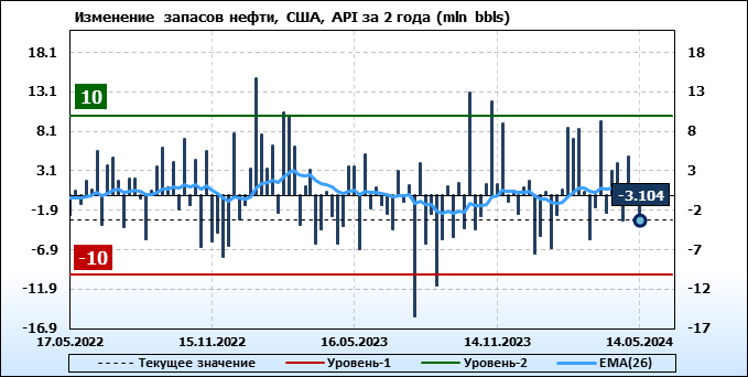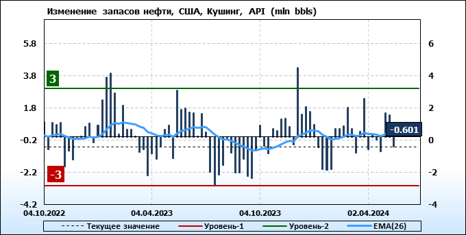 Коммерческие запасы нефти в США по данным института API упали на 3.104 млн. баррелей, при прогнозе +1 млн. баррелей.