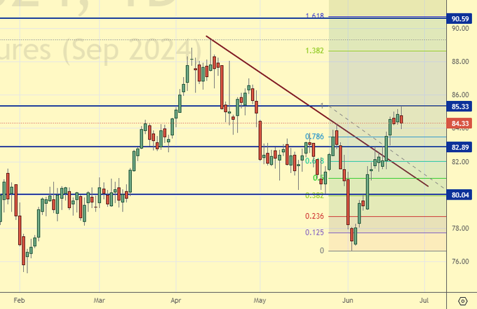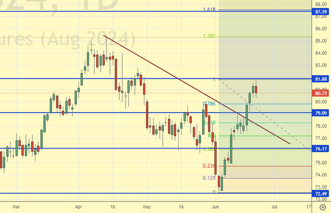 Сценарий роста: рассматриваем июльский фьючерс, дата экспирации 31 июля. Было бы интересно купить от 80.00. Покупки после роста выше 86.00 возможны, но их лучше осуществлять на «часовках».