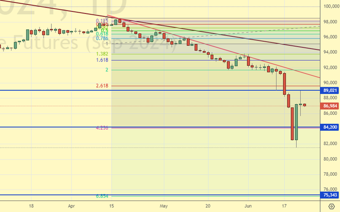 Сценарий роста: рассматриваем сентябрьский фьючерс, дата экспирации 19 сентября. Уровень 89000 ключевой. Пока мы ниже него, не покупаем. Однако, от 76000 покупаем обязательно.